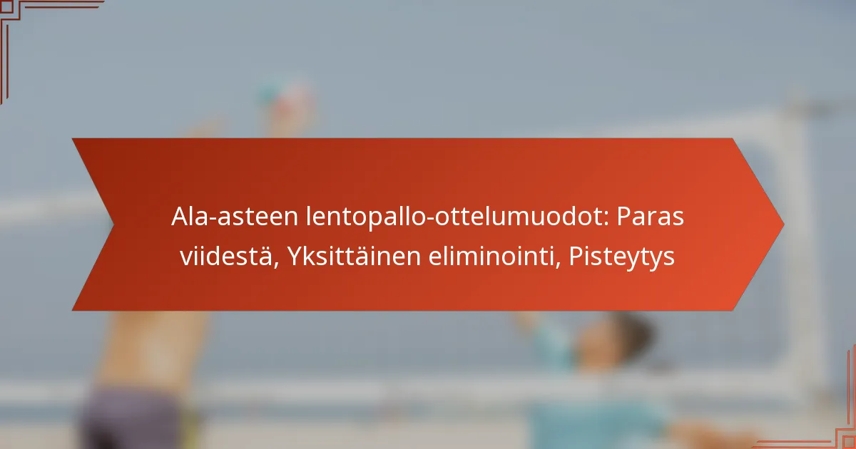 Nuorten yläkoulun lentopallossa pääottelumuodot sisältävät paras kolmesta – ja yksittäisen eliminoinnin, joista kummallakin on ainutlaatuisia ominaisuuksia, jotka vaikuttavat pelin kulkuun ja turnauksen etenemiseen. Pisteytysjärjestelmät, kuten rallipisteytys ja perinteinen pisteytys, ovat keskeisiä otteluiden lopputulosten määrittämisessä ja vaikuttavat siihen, miten joukkueet ansaitsevat pisteitä. Näihin muotoihin perehtyminen on olennaista kilpailujen tehokkaassa järjestämisessä ja joukkueiden suorituskyvyn maksimoimisessa.